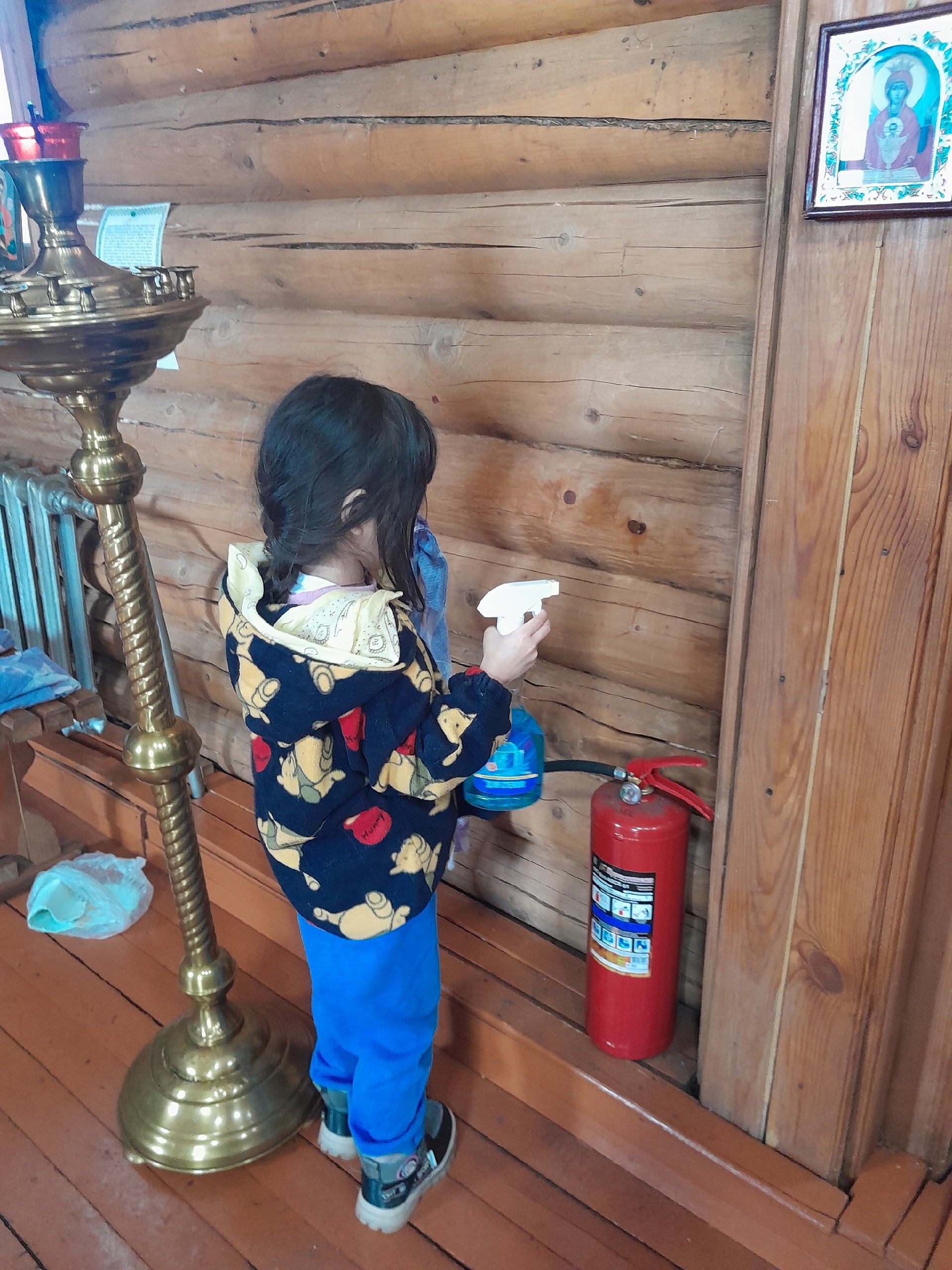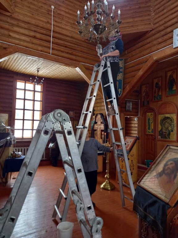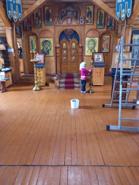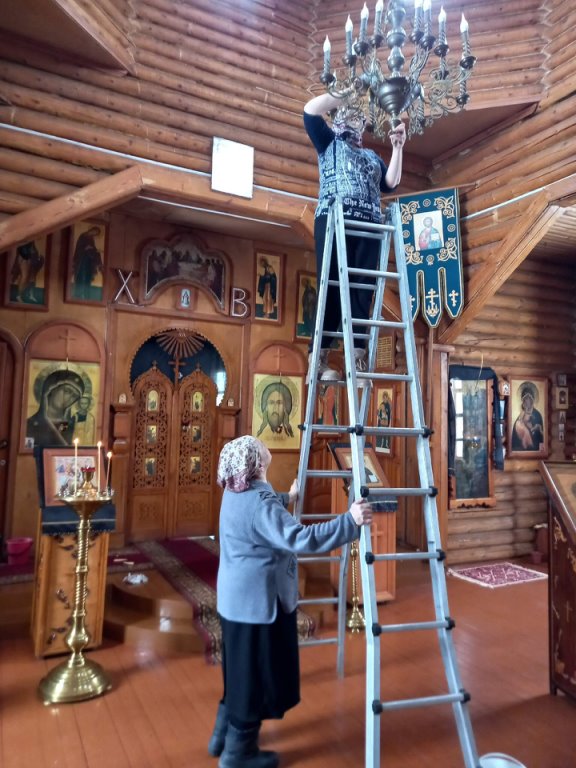 Уборка в храме считается богоугодным делом. Прихожане могут помогать храму, например, мыть окна, пылесосить ковры в алтаре, чистить подсвечники и очищать полы от застывших капель воска.